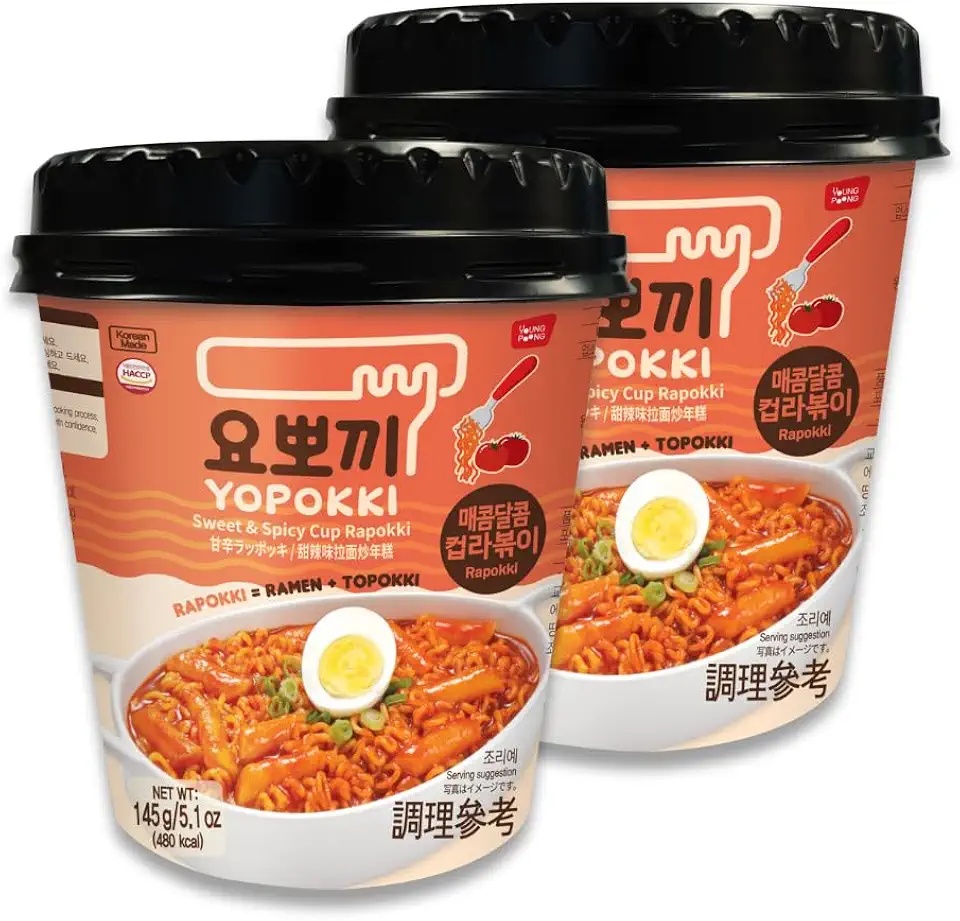 Yopokki Rice Cakes with Ramen Noodles – 2 cups in Sweet & Mild Spicy flavor. Combines chewy tteokbokki with ramen for a satisfying, filling Korean meal in minutes.