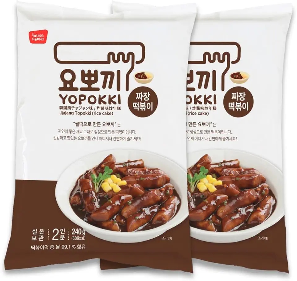 Yopokki Jjajang Topokki Pack – pack of 2. Savory black bean sauce with chewy rice cakes for a delicious Korean-Chinese fusion snack. Great variety option.